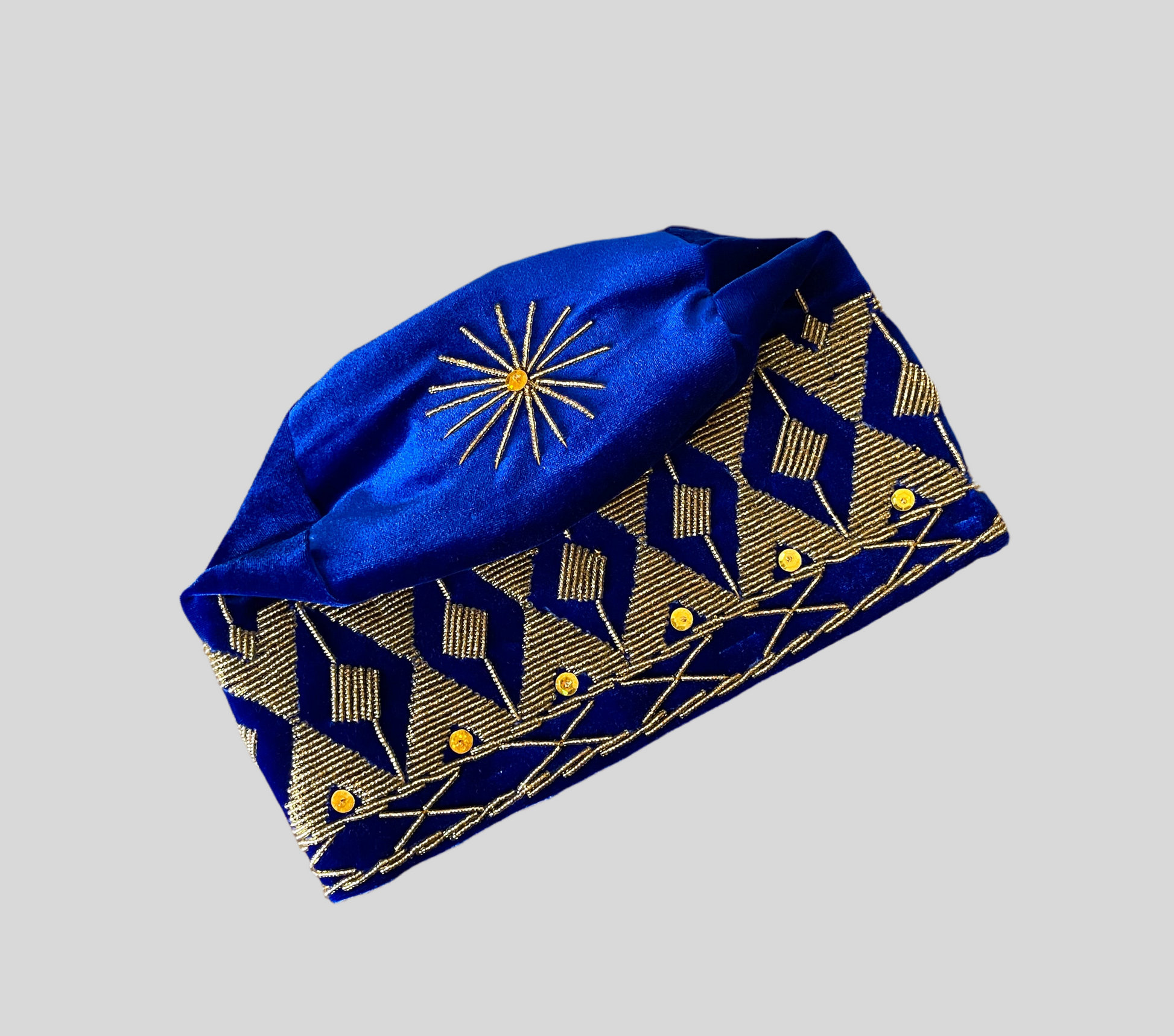 Blue and Gold Akogun traditional yoruba wedding beaded hat