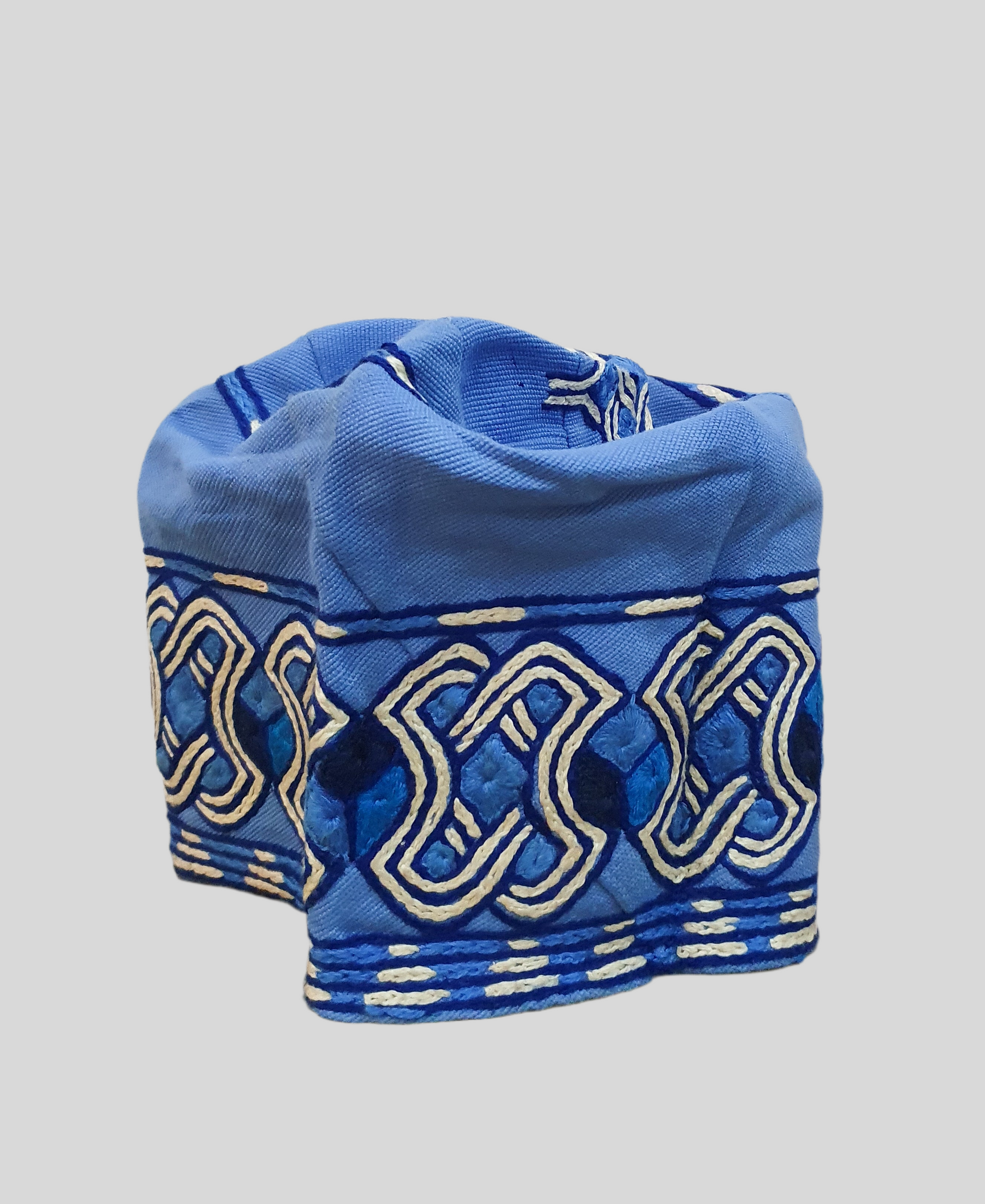 Powder blue aso-ofi fabric with cream and deep blue accent embroidery design. It is worn for special occasions such as weddings, Birthdays, Engagement events. Hand knitted with quality cotton aso oke. A perfect cap for your kaftan, Agbada, Native mens wear and all types of African Mens suit